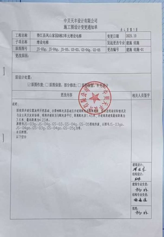 ******街道凤山家园B栋2单元位于凤山家园小区内,根据《重庆市既有住宅增设电梯管理办法》,于2025年10月16日通过既有住宅增设电梯联合审查并送达联合审查意见表,经考虑现场实际情况及与业主双方友好协商,原垫江县凤山家园B栋2单元设电梯项目,因按原井道位置放样开挖基础,会影响配电房基础且井道离配电房距离较近,现将井道改为与配电房平行,距离配电房1.45米,井道离原建筑最短距离为3.6米,最远距离为4.23米。原2025年9月29日公示的电梯原图号JS-03g,JS-04g,GS-03、GS-04g、GS-05图纸作废,其他公示资料不变,现将施工图JS-03ga、 JS-04ga、GS-03g、GS-04ga,GS-05g为准。图纸变更资料进行现场公示、公开征求利害关系人意见。